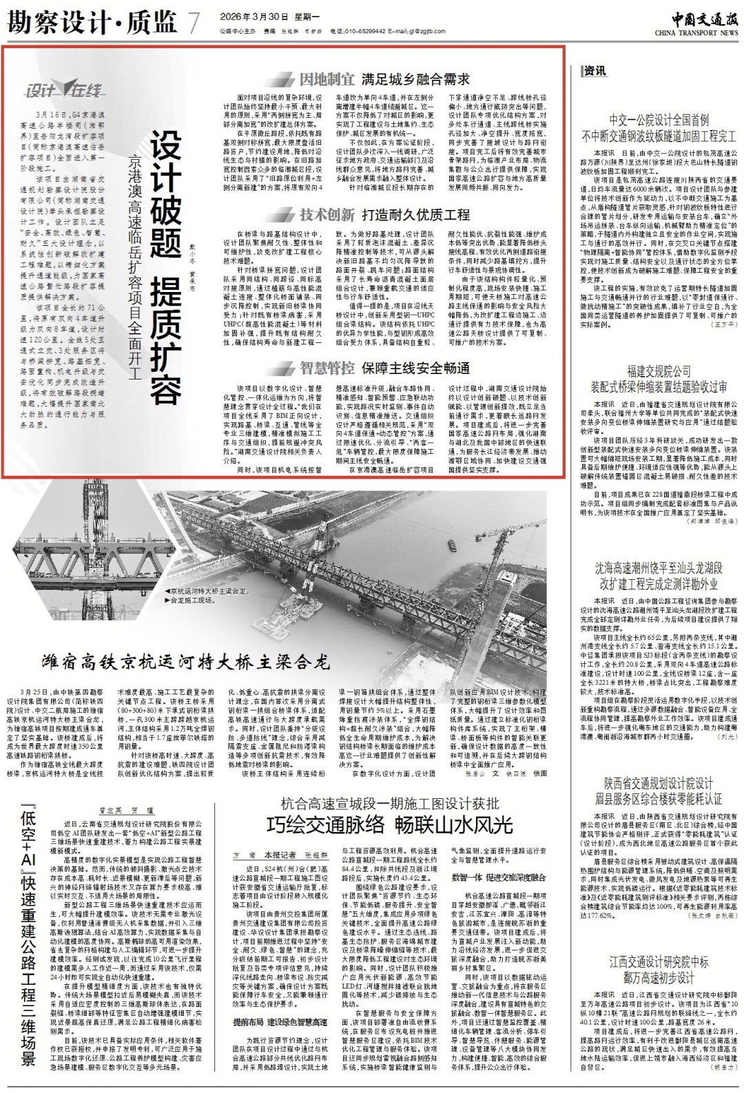 3月16日,G4京港澳高速羊樓司(湘鄂界)至岳陽龍灣段擴容項目(簡稱京港澳高速臨岳擴容項目)全面進入第一階段施工。該項目由湖南省交通規劃勘察設計院股份有限公司(簡稱湖南交通設計院)牽頭承擔勘察設計工作。設計團隊立足“安全、高效、綠色、智慧、耐久”五大設計理念,以系統性...
