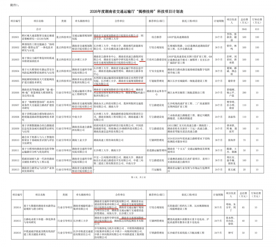 日前,2026年度湖南省交通運輸廳“揭榜掛帥”科技項目榜單正式揭曉。湖南省交通規劃勘察設計院股份有限公司憑借扎實的技術儲備與前瞻的戰略布局,成功揭榜九大項目,在交通科技賽道上跑出“加速度”,彰顯了企業在核心關鍵技術中的硬核擔當。 此次發布的年度重點科技項目中,湖南...