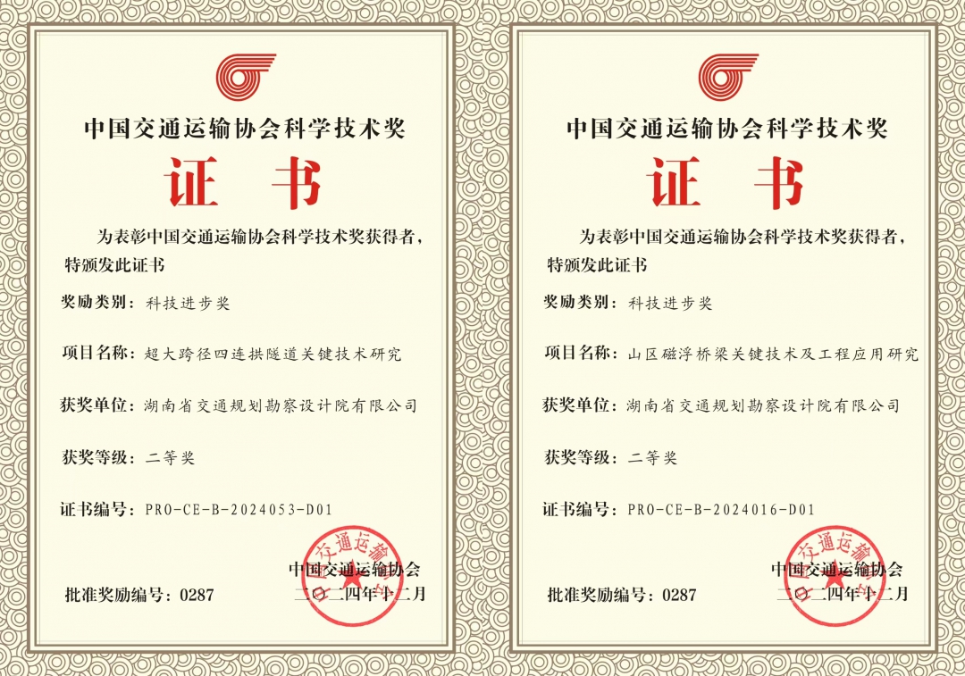 近日,湖南省交通規劃勘察設計院有限公司在科技創新與工程創優領域捷報頻傳:2項核心技術成果榮獲2024年度中國交通運輸協會科技進步二等獎;27項工程勘察設計成果在湖南省優秀工程勘察設計成果評定中榮獲9項一等獎、8項二等獎、10項三等獎,獲獎數量與質量均創造歷史紀錄,彰顯了行業...